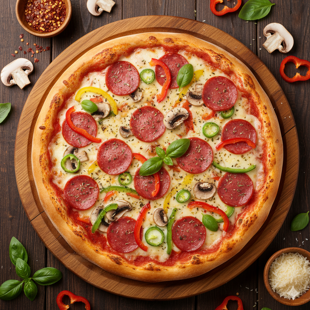 Salami, Ham, Mushrooms, Mix Peppers, Jalapenos & Herbs